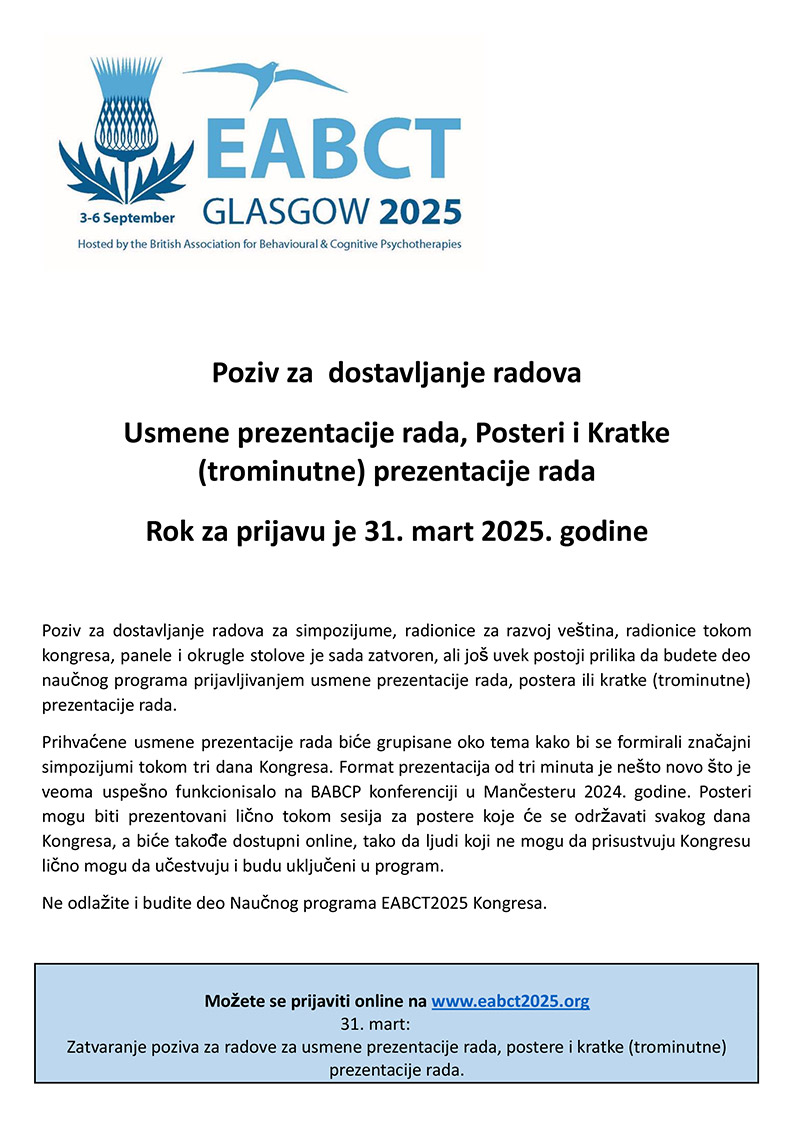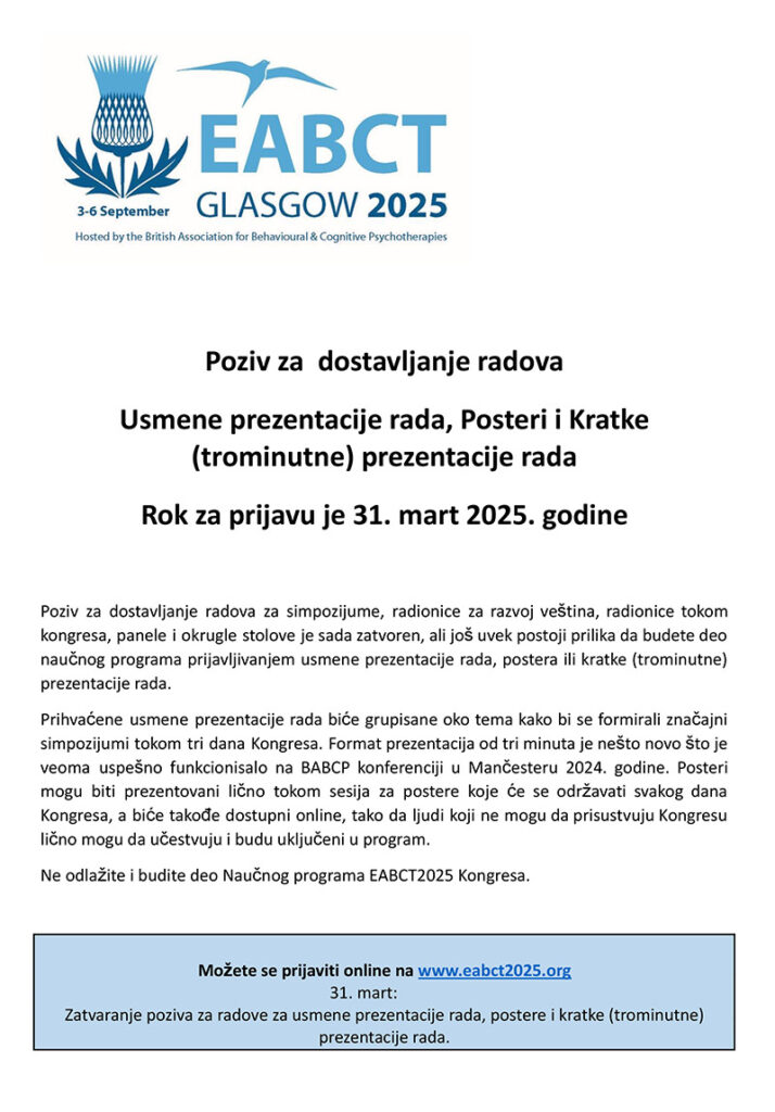 Podsećamo vas da će se ovogodišnji kongres Evropske asocijacije za bihejvioralne i kognitivne terapije (EABCT) održati u Glasgowu od od 3 – 6. septembra 2025. godine.