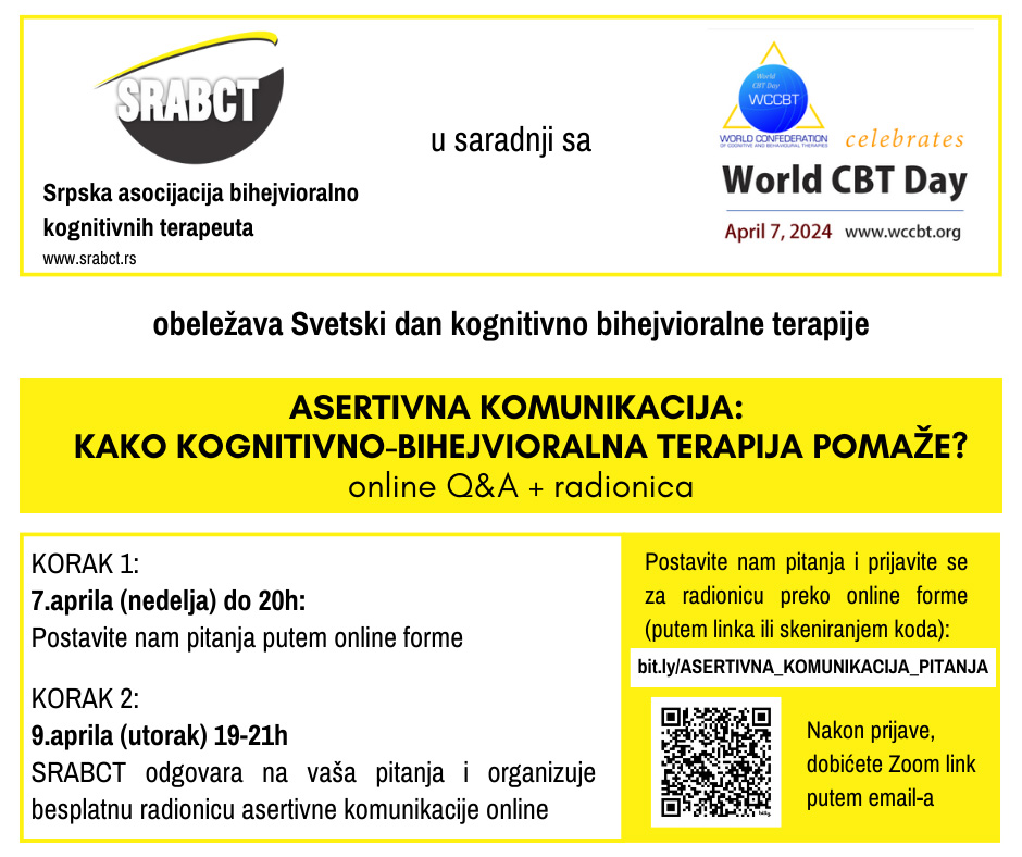Srpska asocijacija bihejvioralno kognitivnih terapeuta (SRABCT) povodom obeležavanja Svetskog dana kognitivno-bihejvioralne terapije, a na inicijativu Svetske konfederacije kognitivnih i bihejvioralnih terapija (WCCBT) organizuje online susret na temu „Asertivna komunikacija: kako kognitivno bihejvioralna terapija pomaže?“, tokom kojeg će odgovarati na vaša pitanja i organizovati online radionicu.
