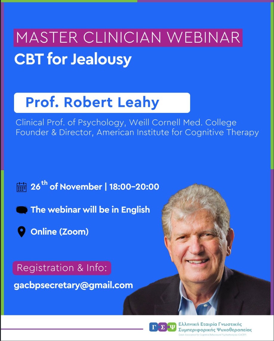 Zadovoljstvo nam je da vas obavestimo da će prof. Robert Leahy održati vebinar na temu „KBT za ljubomoru“ („CBT for Jealousy“).